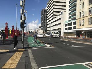 Associate Minister of Transport Julie-Anne Genter has helped install the new contra-flow cycleway on Federal Street.